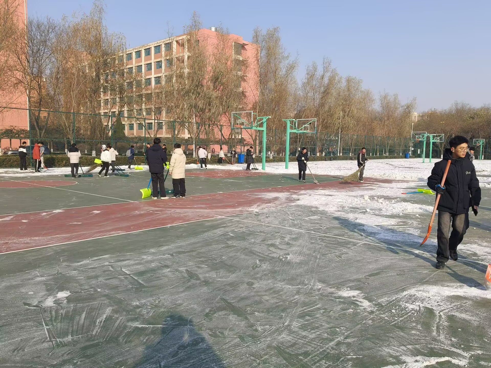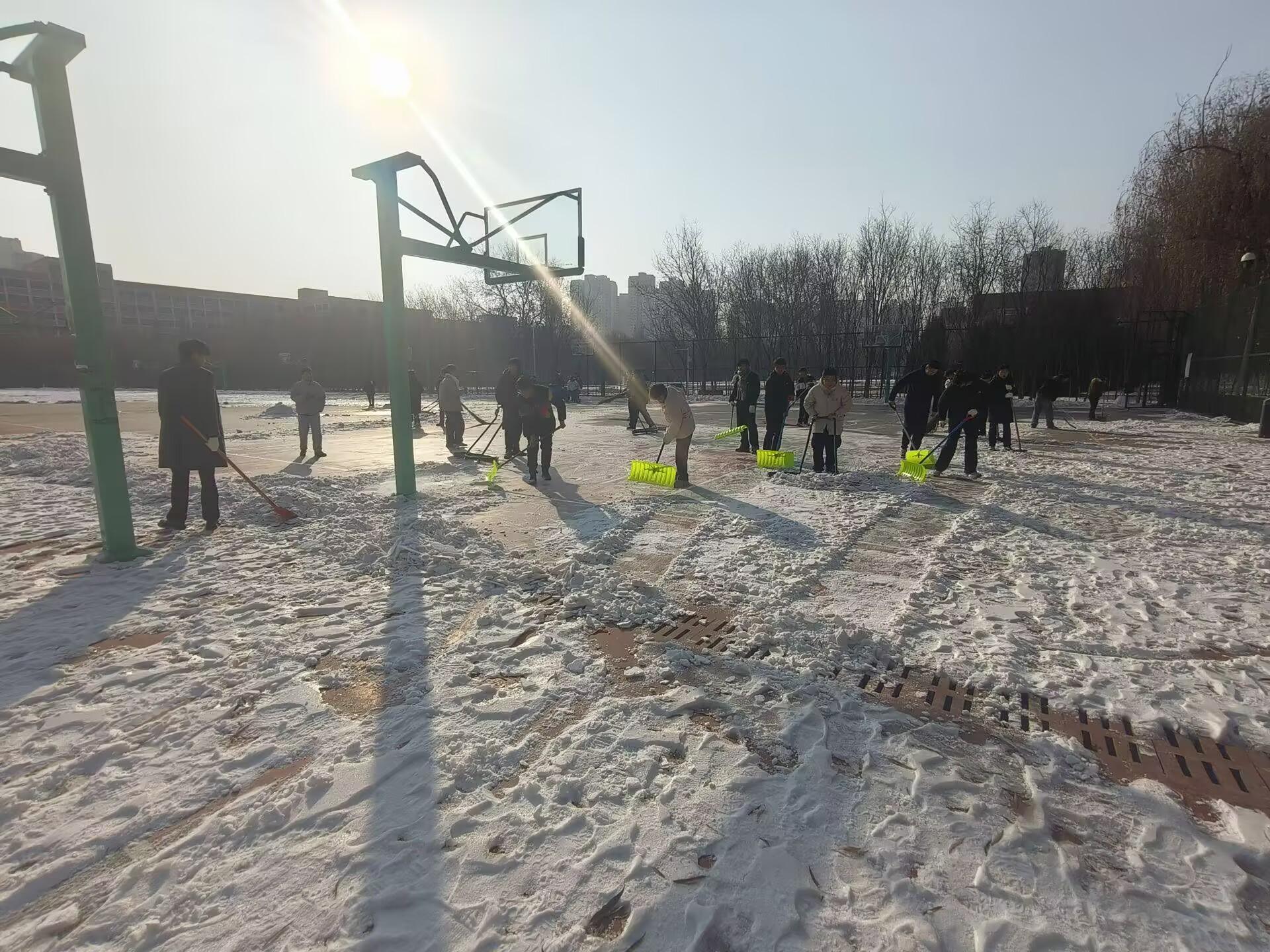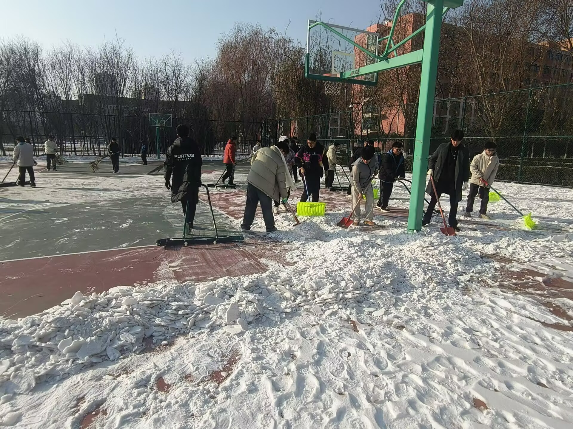 在现场,志愿者们干劲十足,手持扫帚、铁锹等工具,满怀激情地投入到扫雪除冰的“战役”中。大家分工明确,团结协作,有的同学挥舞扫帚清扫积雪,有的用力铲除冰块,很快将冰雪覆盖的篮球场清理干净。