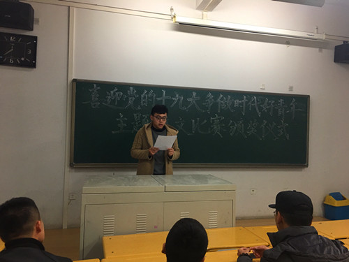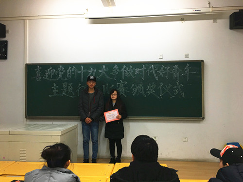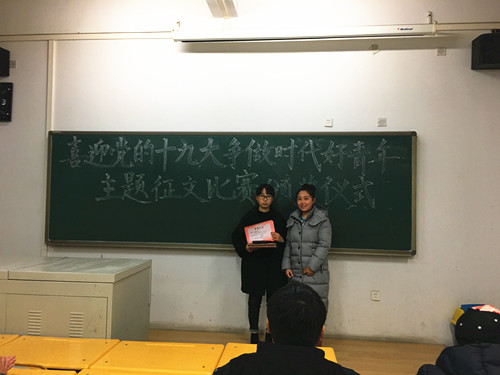 举办了喜迎党的十九大争做时代好青年征文比赛,本次比赛于2017年12月5日晚19:30在4号楼413室举行了征文比赛颁奖仪式。