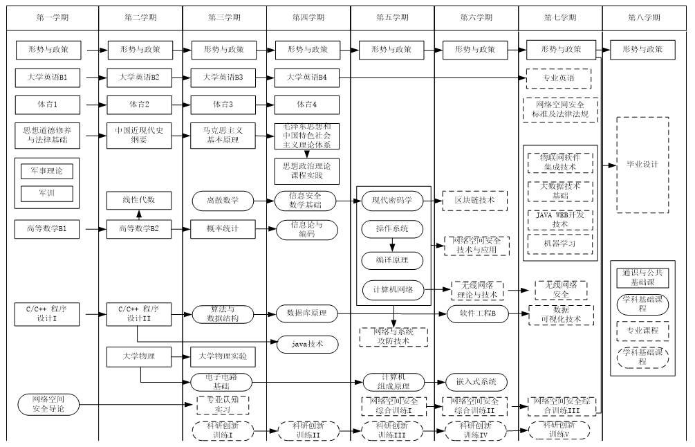 离散数学、算法与数据结构、计算机组成原理、操作系统原理、数据库原理、软件工程、编译原理、计算机网络、嵌入式系统、信息论与编码、信息安全数学基础、现代密码学、网络空间安全技术与应用、网络与系统攻防技术、无线网络理论与技术、无线网络安全、区块链技术等。