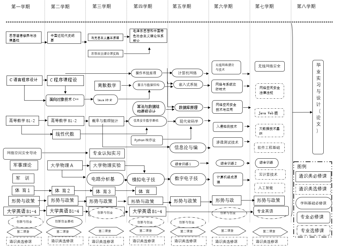 电路分析基础、模拟电子技术、数字电子技术、离散数学、算法与数据结构、操作系统原理、计算机组成原理、数据库原理、计算机网络、嵌入式系统、信息论与编码、信息安全数学基础、现代密码学、入侵检测技术、渗透测试技术、网络空间安全技术与应用、网络与系统攻防技术、无线网络技术、无线网络安全等。