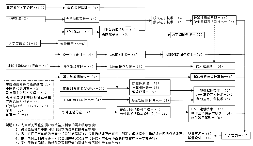 面向对象技术、算法与数据结构、操作系统原理、计算机组成原理、数据库原理、软件工程导论、面向对象的软件工程、编译原理、计算机网络、软件质量保证与测试、UML建模技术、大型数据库技术、软件项目管理、软件体系结构与设计模式、嵌入式系统、C++程序设计、C#编程技术、Java Web编程技术、专业英语等。