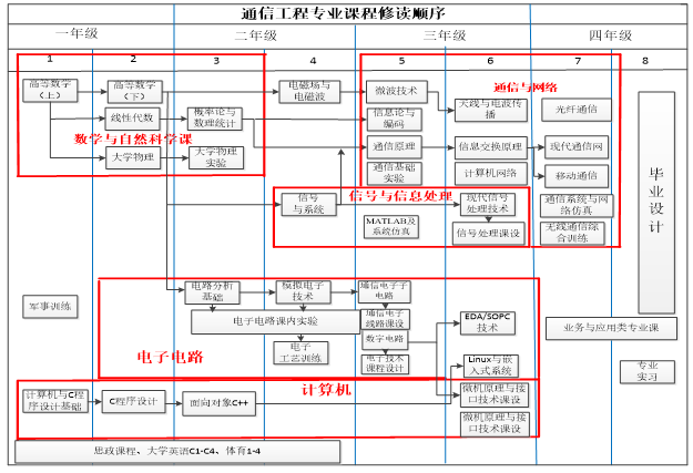 模拟电子技术、数字电子技术、通信电子线路、电磁场与电磁波、微波技术、微机原理与接口技术、信号与系统、现代信号处理技术、通信原理、信息交换原理、光纤通信、现代通信网、移动通信等。