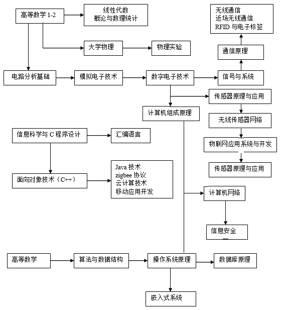 高等数学、电路分析基础 、模拟电子技术、 数字电子技术 、算法与数据结构 、计算机网络 、操作系统原理 、计算机组成原理 、信号与系统 、传感器原理与应用 、通信原理、信息科学与c程序设计、面向对象技术(C++)、单片机原理与技术、嵌入式系统、数据库原理、 JAVA技术、zigbee协议、MATLAB与系统仿真、移动应用开发等。