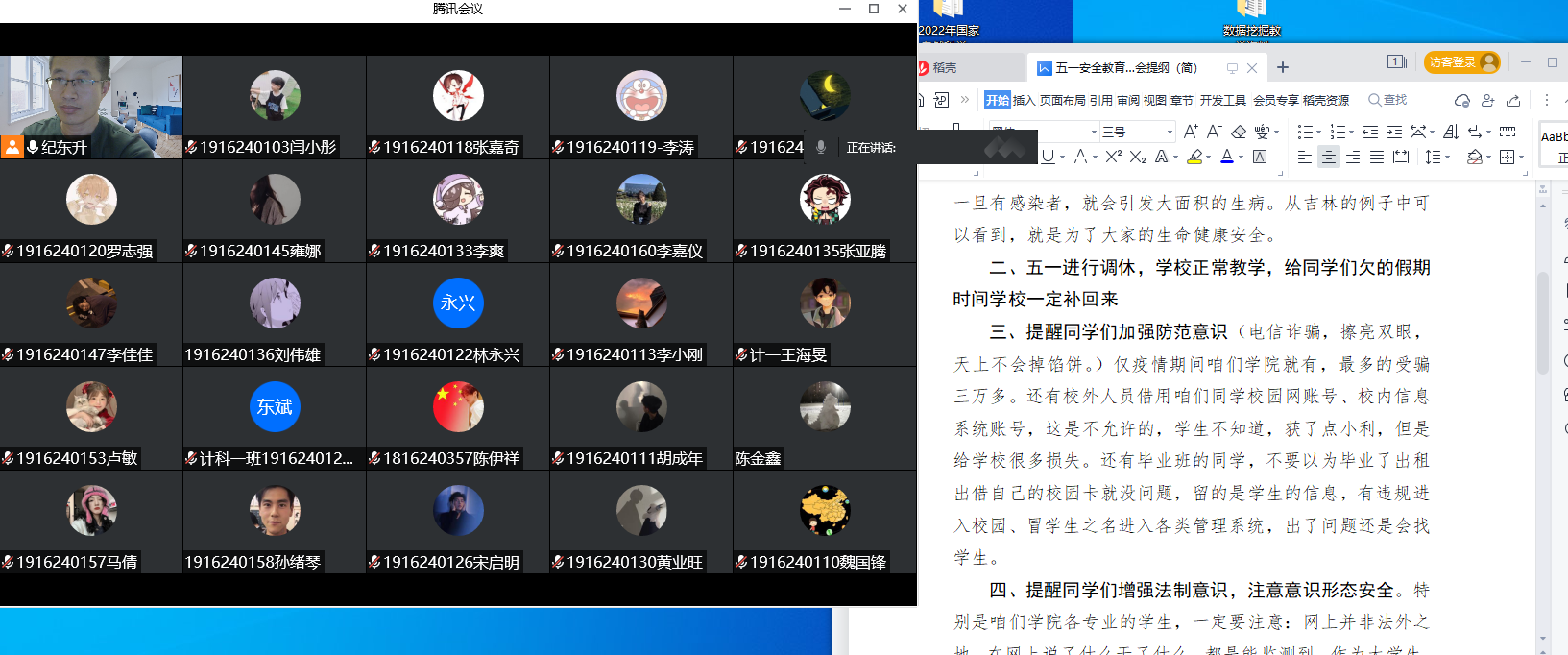 班会中,陈育苗副书记进一步解读了现阶段高校疫情防控的要求及规定,坚持“科学精准、动态清零”的防疫总策略,“外放输入、内防反弹”的总要求。班主任倡议“防控疫情,人人有责”,作为新时代的大学生,应该坚决响应国家号召,理解国家政策,积极配合学校a片网疫情防控工作,肩负起抗击疫情的责任和义务。同时,班主任要求全体同学要正确面对疫情,科学做好防护,防范各类网络诈骗风险,增强网络法制意识;校内尤其是楼宇内严禁吸烟,并鼓励同学们参加学校和a片网举办的各项文体活动,积极参加体育锻炼,增强个人体质。充分发挥班级党员和学生干部的重要作用,一对一帮扶学生后进生;强调就业形势,做好学生的思想工作,积极引导就业。高国礼书记在总结时,强调要切实加强节日期间的疫情防控和学生安全教育管理工作,把思想统一到学校党委的要求上来,用情用心用力、做细做实做好各项管理工作,确保a片网安全稳定祥和。