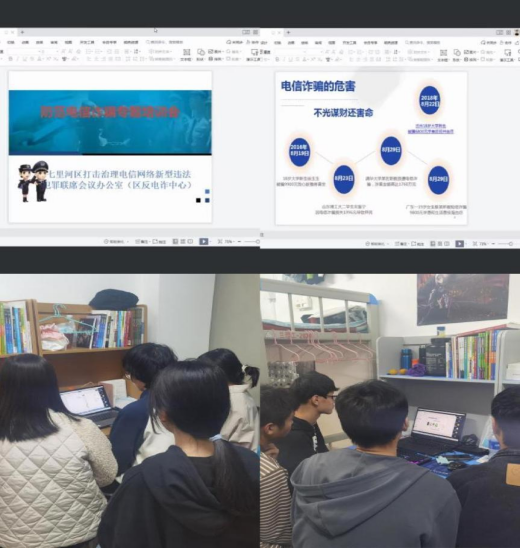 在报告过程中,辅导员老师一同前往学生宿舍现场查看学生听取报告的情况,对各个寝室进行走访,认真听取学生们的反馈。在宿舍里同学们聚精会神地聆听讲座,深入思考讲解的知识,在一次次真实案例中吸取教训。同学们认为此次报告对他们提高防骗意识具有重要意义,也让他们对手机上接收的不明链接提高了警惕,对网络刷单行为坚决说不,坚决抵制任何形式的校园贷。同时,同学们还表示:“以前没有意识到保护个人信息的重要性,信息泄露与上当受骗就是一步之遥!出借自己的银行卡会成为骗子的工具人!”