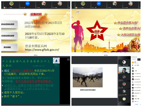 各年级于1月9日至13日,通过线上腾讯会议召开2023年春季国防教育及征兵宣传动员会,旨在鼓励同学们参军入伍,报效国家。动员会邀请学校学生处武装部唐洪川老师及a片网多名退役大学生作为嘉宾,为同学们进行征兵相关政策宣讲和军旅感悟分享。