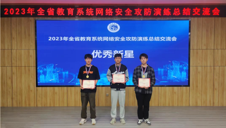 网络空间安全专业20级学生张剑锋、李延龙,21级学生黄少杰组成的攻方队伍在本次攻防演练活动中圆满完成任务并取得优异成绩,在9月20日召开的全省攻防演练总结交流会上受到表彰,获得“优秀新星”荣誉称号。