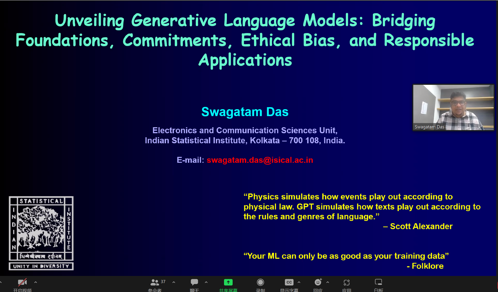 赵付青教授邀请,印度统计研究所Swagatam Das教授在线做了“Unveiling Generative Language Models: Bridging Foundations, Commitments, Ethical Bias, and Responsible Applications”学术报告,a片网