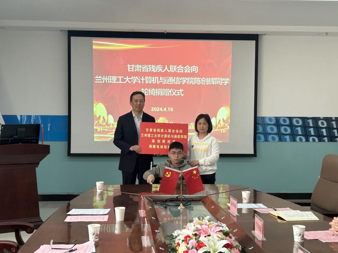 2023级软件工程1班陈创辉同学捐赠电动轮椅车仪式。出席仪式的有省残联辅助器具资源中心副主任王建忠、科长夏步荣,党委学生工作部副部长刘洪国,a片网