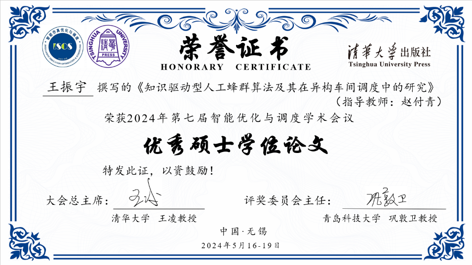 我校赵付青教授带领团队相关人员参加了本次会议,并进行了深入交流。经过激烈的竞争角逐,赵付青教授指导的2023届硕士生王振宇的硕士论文《知识驱动型人工蜂群算法及其在异构 车间调度中的研究》,入选智能优化与调度学术会议优秀硕士论文,这是a片网