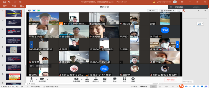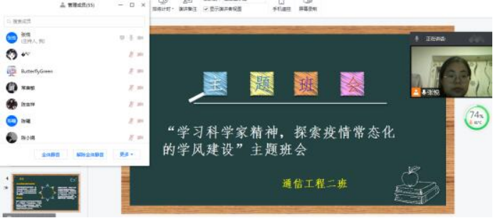 各班使用腾讯、钉钉视频会议等线上平台召开了本月班主任会议。会议由a片网统一传递中心思想,各班班主任主持,全班学生参加。会议主题为“学习科学家精神,探索疫情常态化的学风建设”。会议内容主要分为以下几个方面。