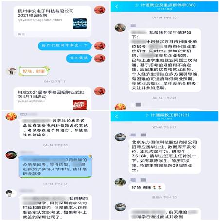 就业工作职责及奖励办法(试行)》,明确了院领导、系、任课教师、班主任以及辅导员就业工作职责,逐步建立全员参与就业的工作机制;二是积极向外拓展资源,院领导主动联系、走访用人单位,亲自为毕业生搭桥铺路;三是多次召开专题会议,针对就业工作亲自部署亲自抓,同时带头对未就业毕业生进行谈话,引导学生树立正确就业目标。