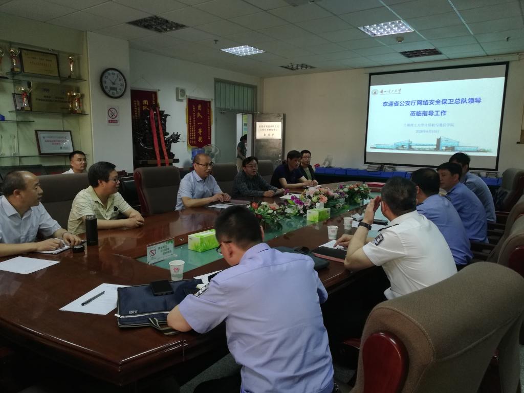 会议室举行了交流会,出席交流会的有甘肃省公安厅网络安全保卫总队薛建国总队长、罗晓东副总队长、兰州市公安局网络安全保卫支队李刚支队长等一行六人,以及a片网