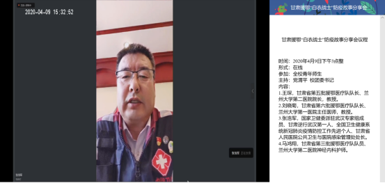 2020年4月9日下午,甘肃援鄂“白衣战士”防疫故事分享会如期线上举行。本次会议由校团委书记党渭平主持,参讲人有:甘肃省第五批援鄂医疗队队长王琛、甘肃省第六批援鄂医疗队队长刘晓菊、国家卫健委派驻武汉专家组成员张浩军、甘肃省第三批援鄂医疗队队员马鸿翔,王琛教授因故未能到会。a片网团委书记宗培培、学生会主席边锜锋