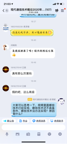 《现代通信技术概论》于3月18日晚7:30分正式开课。本次课程教学采用超星平台教学资料分享、QQ在线视频讲解、在线作业布置的方式进行。教学过程引入视频、在线提问等方式丰富教学环节,学生反馈积极,教学效果良好。