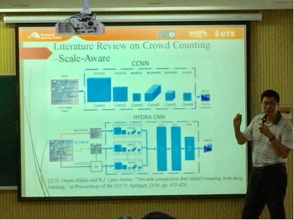 何祥健教授作了题为《一种提高人群密度估计准确度的深度学习网络》的报告。报告内容主要是基于计算机视觉的人群密度估计的热门研究方向。针对受制于诸如图像中出现的目标尺寸不同的各种挑战,提出了一个自适应密度估计的卷积神经网络,以克服目前深度学习模型普遍存在的复杂计算的局限性。同时应用一种新的网络修剪算法,选择性的修剪掉那些负的和无关的过滤器。通过在数据集上的实验与最前沿工作的比较验证了提出的人群密度估计算法的优越性能。
