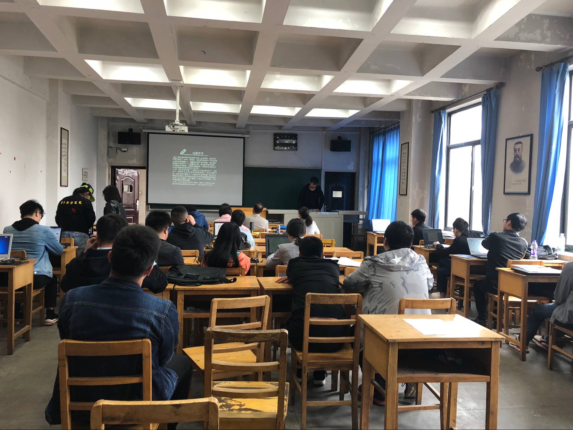 通信工程系在一南406举行了毕业设计中期答辩工作。第二组的答辩组长为何继爱教授,答辩委员为蔺莹、郑玉峰、王维芳、王婵飞四位老师。该组共有40位毕业生参加答辩。
