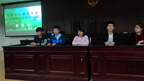 于2018年4月3日晚19:30分在一号楼108教室特举办“暑期社会实践归来话感受”报告会,出席本次报告会的嘉宾有2017年暑假社会实践“把网络带回家”团队成员张瑛学姐,雷涛学长,方洁学姐,青年志愿者协会负责人郭成鑫学长,孙岩学长,本次报告会的观众有2017级全体学生参加。