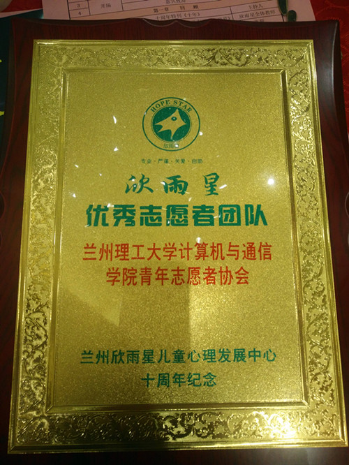 青年志愿者协会颁发了“优秀志愿者团队”荣誉证书,这是对青年志愿者协会的一种肯定,一种鼓励,也是青年志愿者协会每个志愿者努力的结果。相信在以后的日子里,志愿者们会再接再厉,继续坚持发扬志愿精神,传递友爱,传递青春正能量,为欣雨星的孩子们的美好明天贡献自己的一份力量。