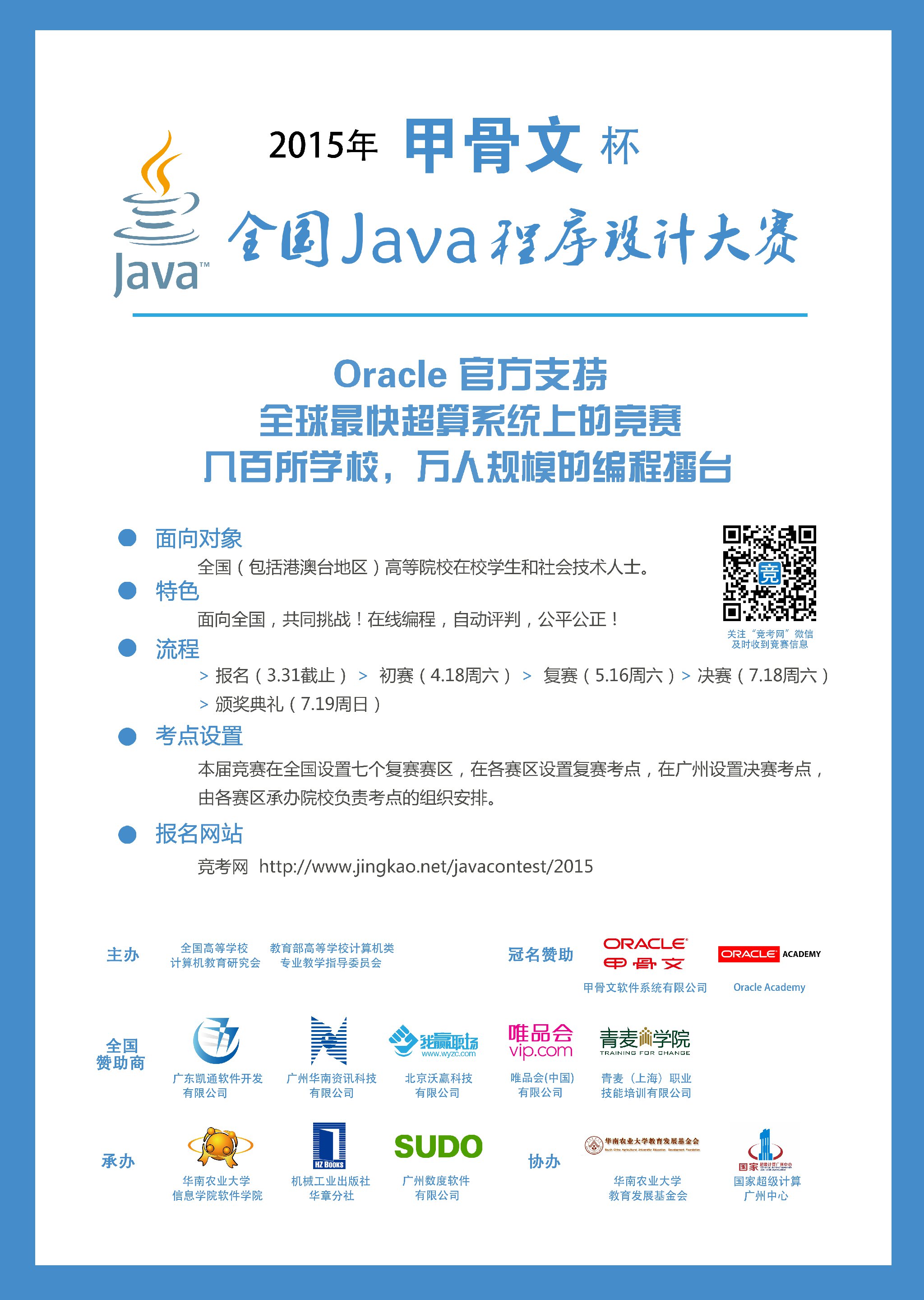 本次赛事由“全国高等学校计算机教育研究会”、“教育部高等学校计算机类专业教学指导委员会”主办,华南农业大学信息a片网、软件a片网等单位承办,国家超计算广州中心、广东省计算机学会等多家单位协办,世界知名IT企业ORACLE(甲骨文)公司作为冠名赞助商,并为本次赛事提供资金和技术方面的支持。