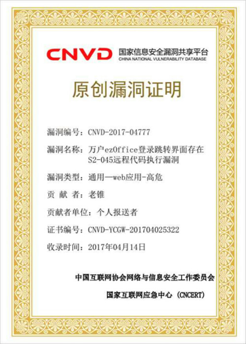 国家信息安全漏洞共享平台收录a片网 学子 发现的网络高危漏洞 收录证书 2017年4月14日,由冯涛教授指导的a片网 网络安全协会骨干成员丁潇同学(14级通信工程专业)提交国家...