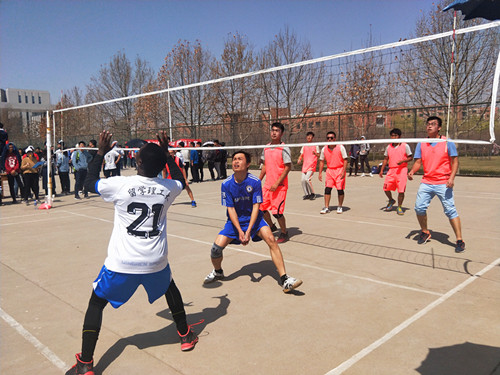 比赛激烈进行中 队员间相互鼓励 双方努力扣球中 为了丰富同学们的业余生活,激发同学们强身健体的意识,校运会男子排球赛于2018年3月29日中午12:50在南村排球场一号场地正式开...