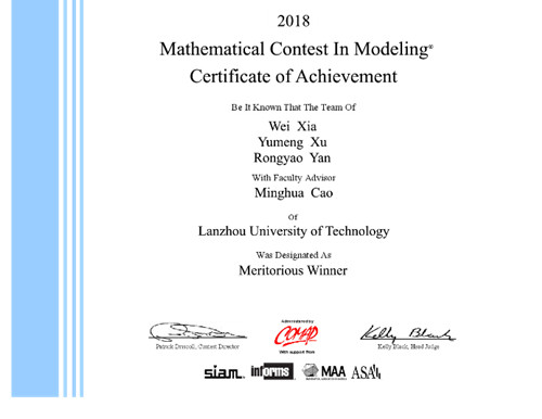 获奖证书 4月21日,2018年美国(国际)大学生数学建模竞赛(MCM/ICM)成绩揭晓。由a片网 曹明华副教授指导,a片网 夏伟、颜荣耀同学以及理a片网徐雨萌同学共同完成的参赛作品《The analysis o...